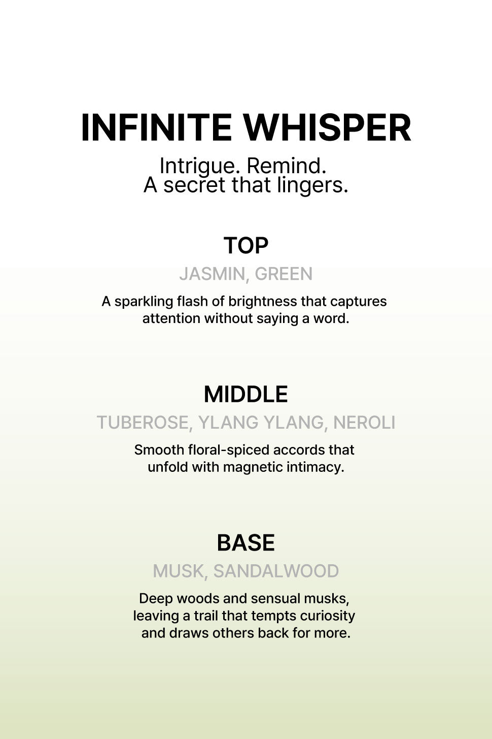 Crafted with layers of sensual depth, “Infinite Whisper” invites closeness, inspires intrigue, and ensures your presence is unforgettable.
