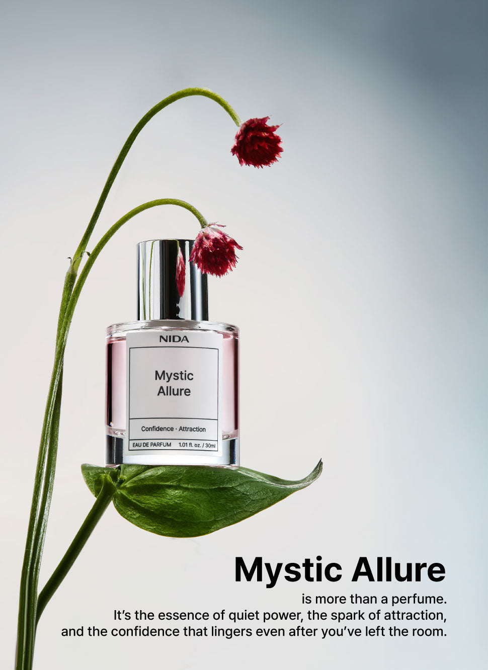 Step into a realm where magnetism meets mystery, and every glance lingers a moment longer. NIDA “MYSTIC ALLURE” Eau de Parfum is crafted for those who command attention without saying a word—sophisticated, enigmatic, and powerfully confident. Designed to ignite intrigue and elevate presence, it cloaks you in an aura of effortless attraction that captivates and endures.