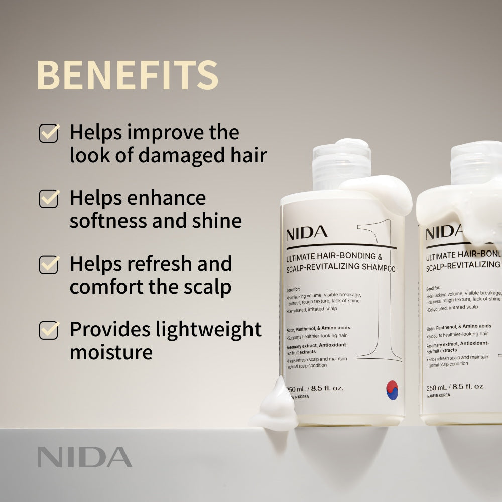 NIDA Ultimate Hair-Bonding Shampoo is a dual-action formula designed to improve the appearance of damaged strands while delivering a deep, refreshing cleanse to the scalp. It combines the power of "bonding" care with soothing botanicals to leave your hair looking fuller, shinier, and feeling incredibly soft—without the heavy buildup.